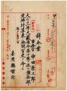 中田榮次郎大正十一年大藏省令第十號ニ依リ預金部受拂計算表ノ檢閱官吏ヲ命ス