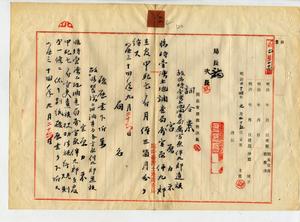 故〔臨時台灣土地調查局〕屬宮原伴九郎遺族〔宮原カネ〕ヘ死亡賜金及死者ノ履歷書下付ノ件