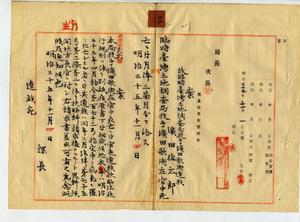 故〔臨時台灣土地調查局〕技手濱田歌衛遺族〔濱田佐太郎〕ヘ死亡賜金及死者ノ履歷書下付ノ件