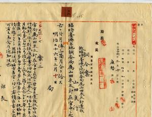 故〔臨時台灣土地調查局〕屬山田米太郎遺族〔山田良行〕ヘ死亡賜金及死者ノ履歷書下付ノ件