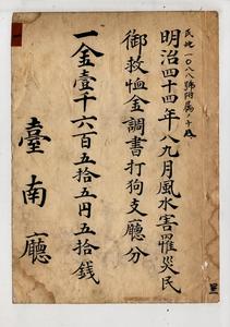 告示第百七十四號四十四年八月下旬ヨリ九月上旬ニ至ル暴風雨罹災者救恤金御下賜ノ件并報告通達等附屬書類