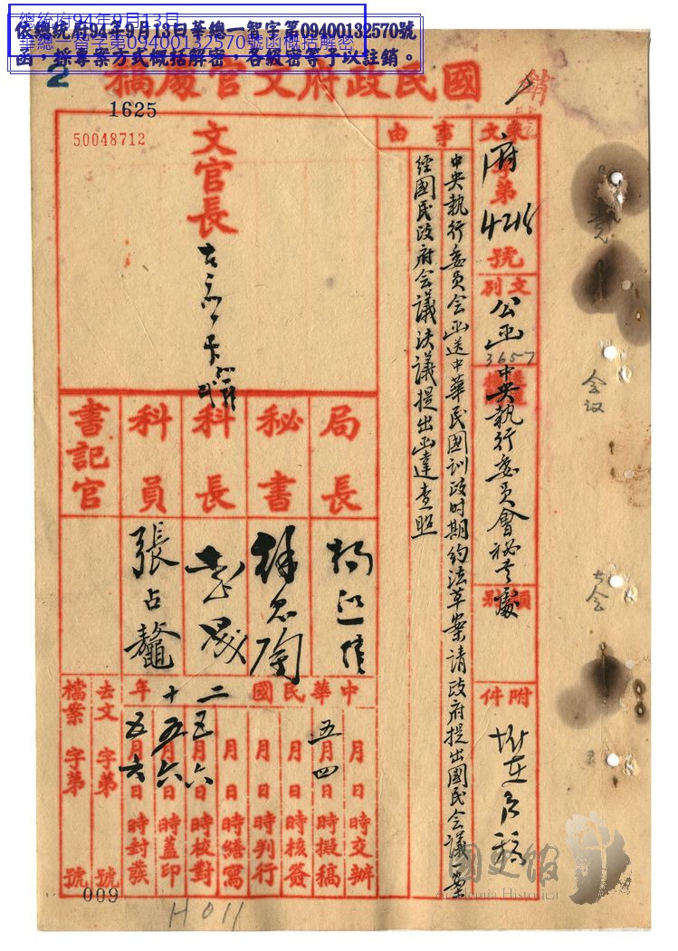 國民政府文官處函中國國民黨中央執行委員會秘書處關於中央執行委員會函為中華民國訓政時期約法草案業經本會通過請政府提出國民會議一案經國府會議決議提出