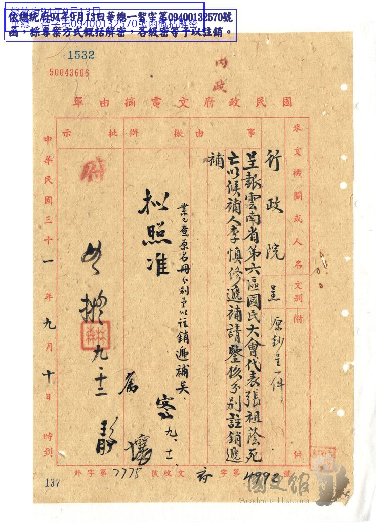 行政院長蔣中正呈國民政府為雲南省第六區國民大會代表張祖蔭死亡請註銷名籍以李慎修遞補