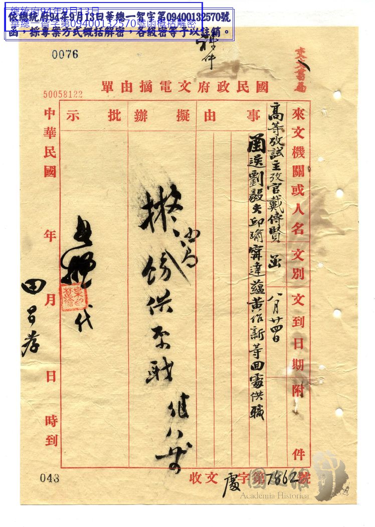 高等考試主考官戴傳賢函國民政府文官處有關劉毅夫等回處供職