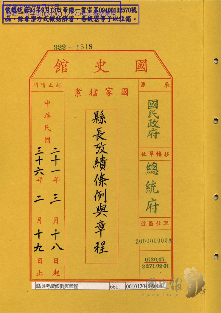 察哈爾縣長考成暫行章程,縣長考績條例及三十五年度縣長考績百分比