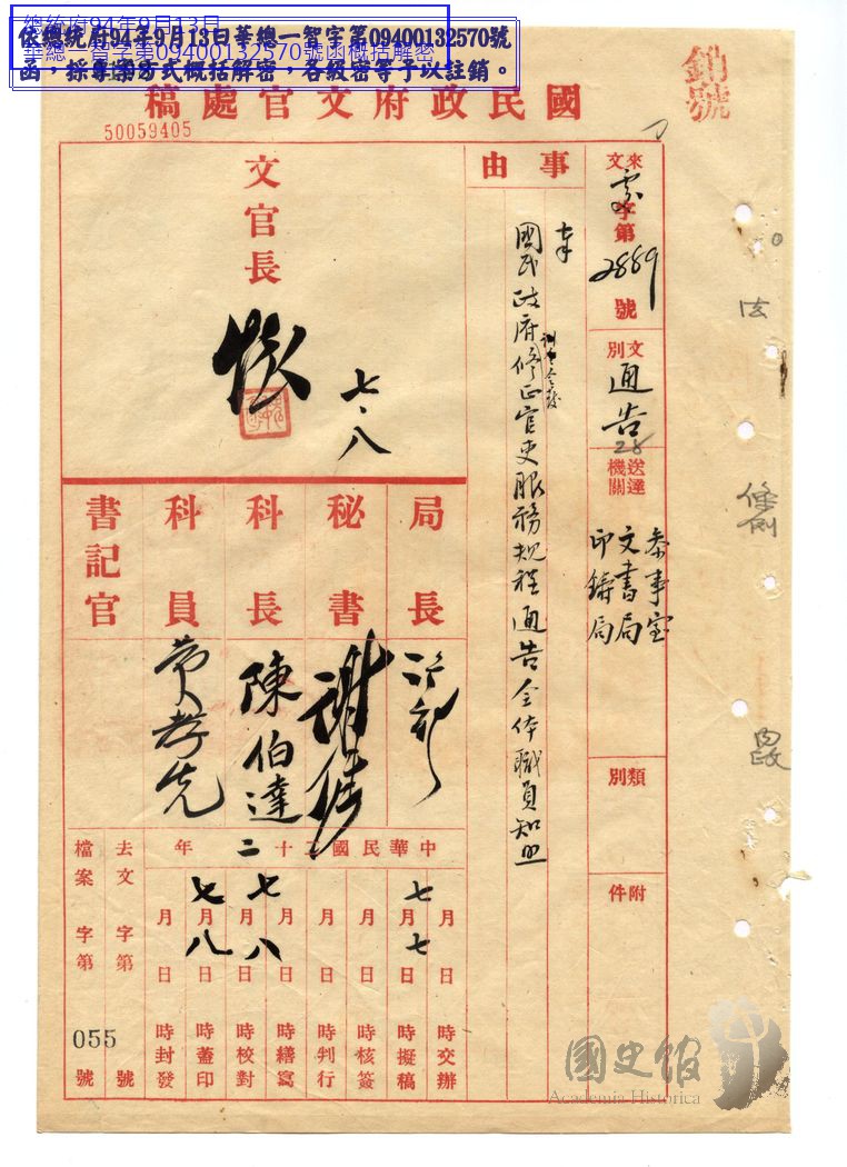 國民政府文官處通告本府參事室文書局印鑄局有關奉國民政府令修正官吏服務規程通告令體職員智照