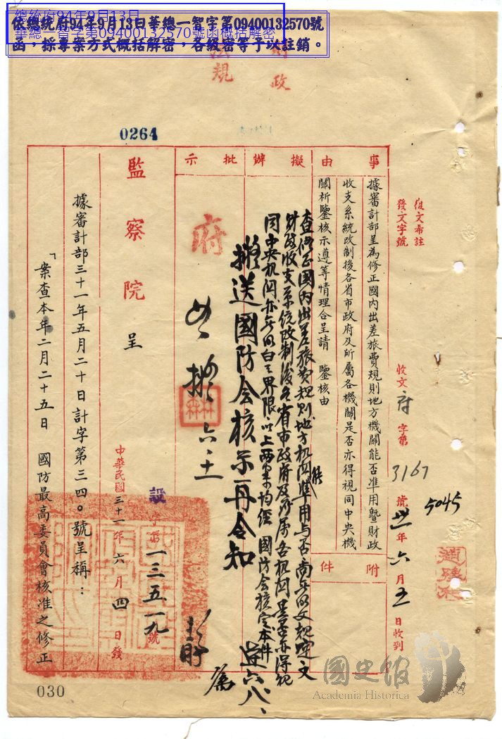 監察院長于右任呈國民政府主席林森為修正國內出差旅費規則地方機關能否准用暨財政收支系統改制後各省市政府及所屬機關是否亦得視同中央機關請鑒核