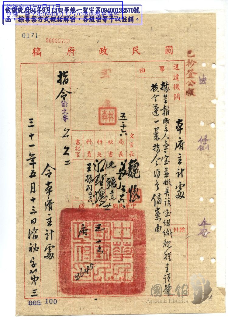 國民政府主席林森指令主計處為成立人事室並擬具人事室組織規程一案准予備案