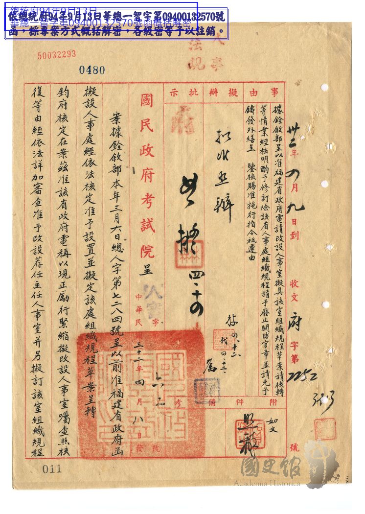 考試院長戴傳賢呈國民政府為福建省政府擬具人事室組織規程草案廢止人事處組織規程並免鑄發關防官章等情請鑒核施行