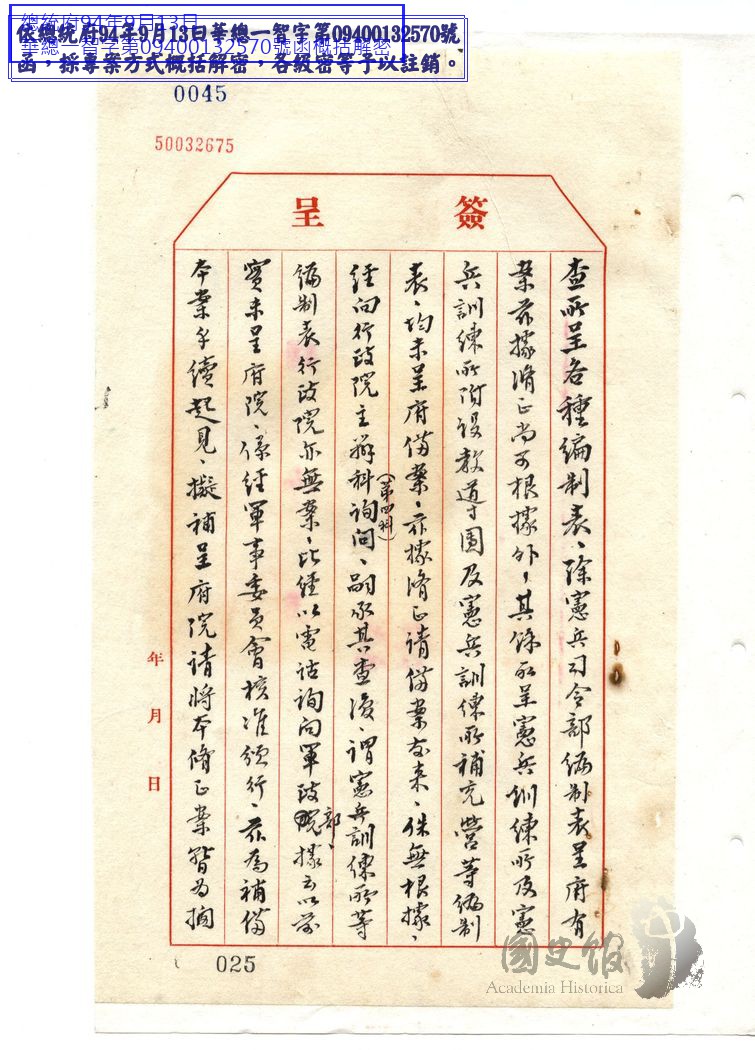 國民政府主席林森指令行政院為憲兵學校條例及編制憲兵訓練所編制憲兵教導團及補充營編制一案准予備案
