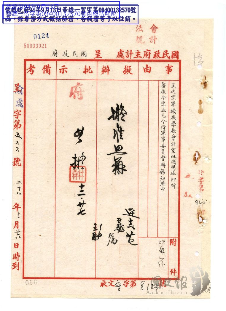 國民政府主計長陳其采呈主席林森為空軍機械學校會計室組織規程請鑒核