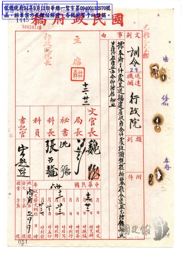 國民政府主席林森訓令行政院為福建省政府會計處組織規程一案應准照辦令仰轉飭知照