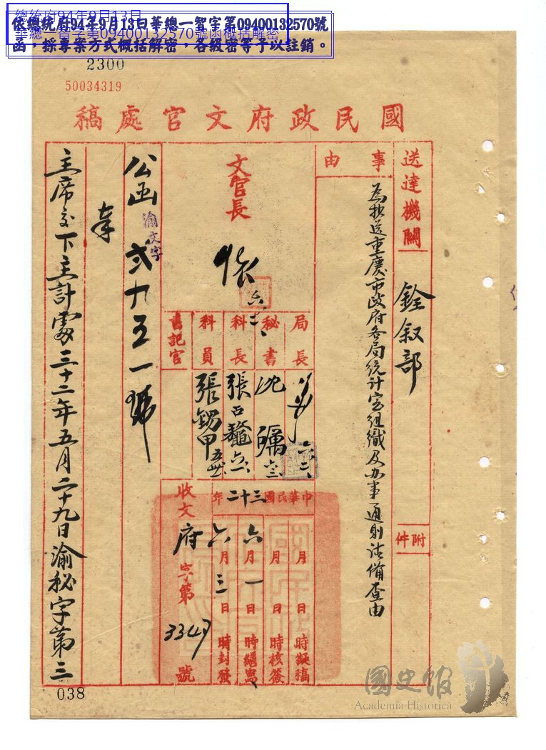 國民政府文官長魏懷函銓敘部為抄送重慶市政府各局統計室組織及辦事通則請備查
