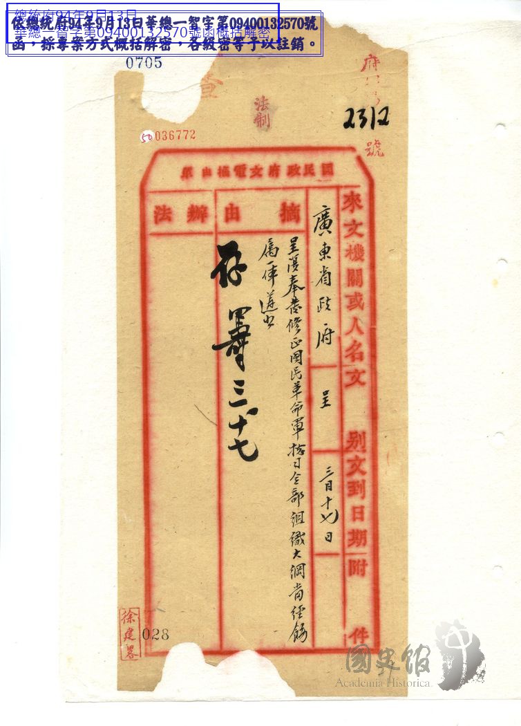 廣東省政府委員會主席李濟深呈國民政府為奉發修正國民革命軍總司令部組織大綱已分令知照