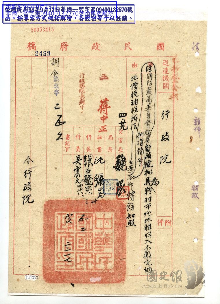 國民政府訓令行政院為戰時市地地租收入不敷完納地價稅補救辦法經國防最高委員會批准備案令仰轉飭知照