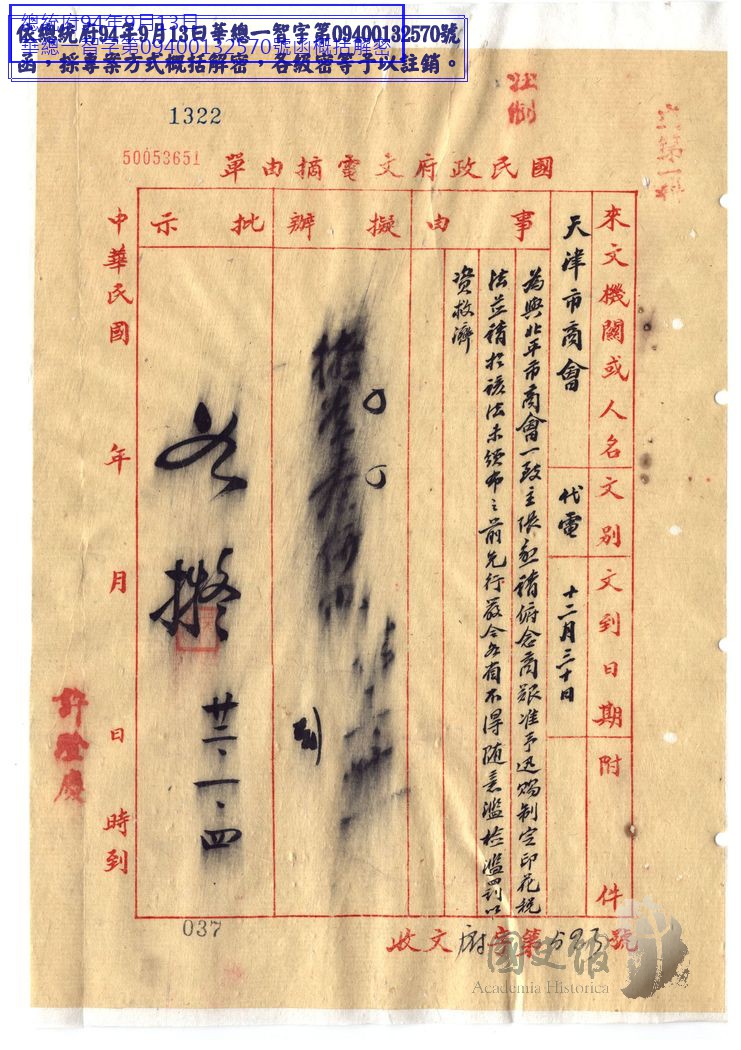 天津市商會電國民政府請迅賜制定印花稅法並請於該法未頒布前不得隨意苛罰以惠人民