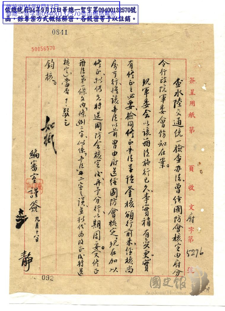 國民政府文官處函國防最高委員會秘書廳為軍事委員會呈送修正水陸交通統一檢查辦法一案奉批轉送國防最高委員會核定函達查照