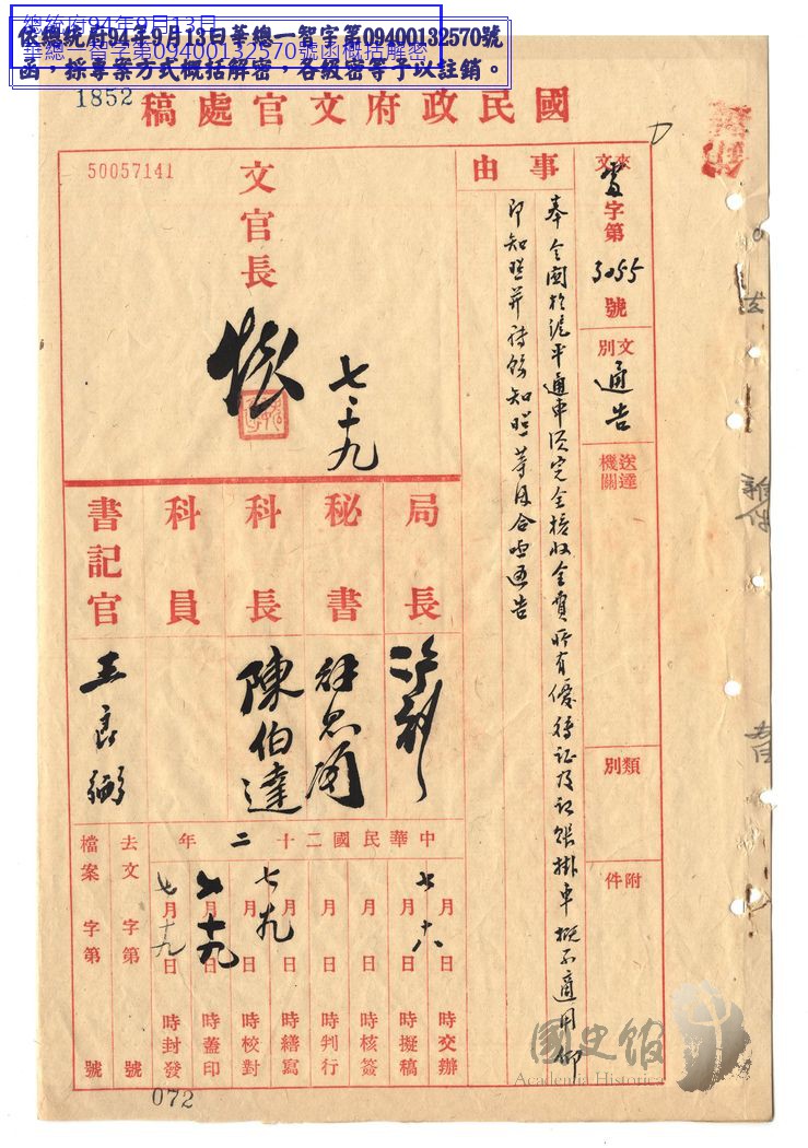 國民政府文官處通告為奉令關於滬平通車須完全核收全費所有優待證及記帳掛車不適用仰即知照等