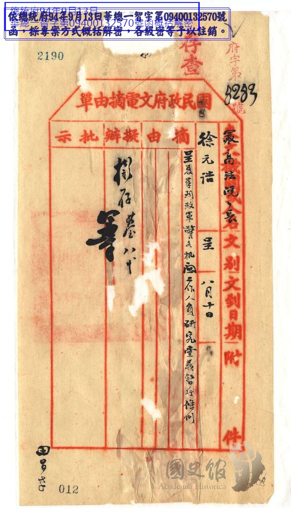 最高法院長徐元浩呈國民政府為呈復奉到政軍警各機關工作人員研究黨義暫行條例