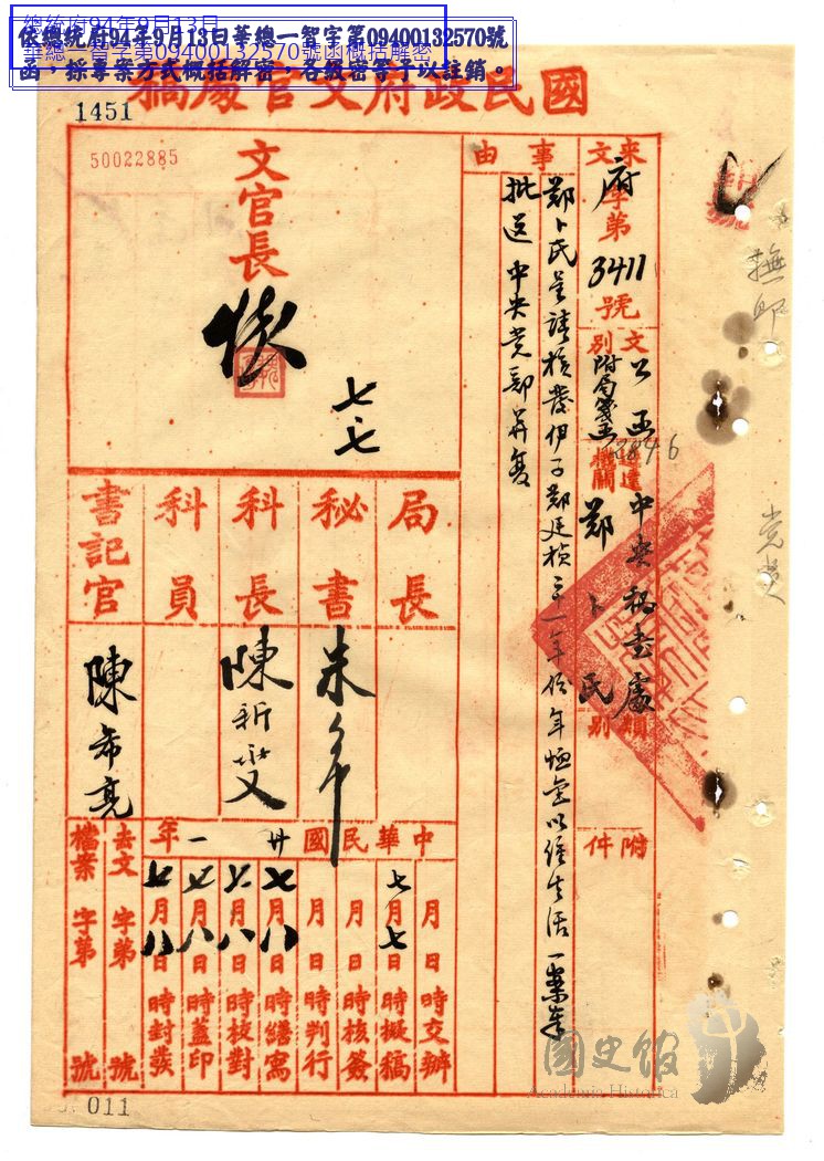 國民政府文官處函中國國民黨中央執行委員會秘書處鄭卜氏有關函送發給伊子鄭廷楨年撫卹金案奉批送中央黨部並復