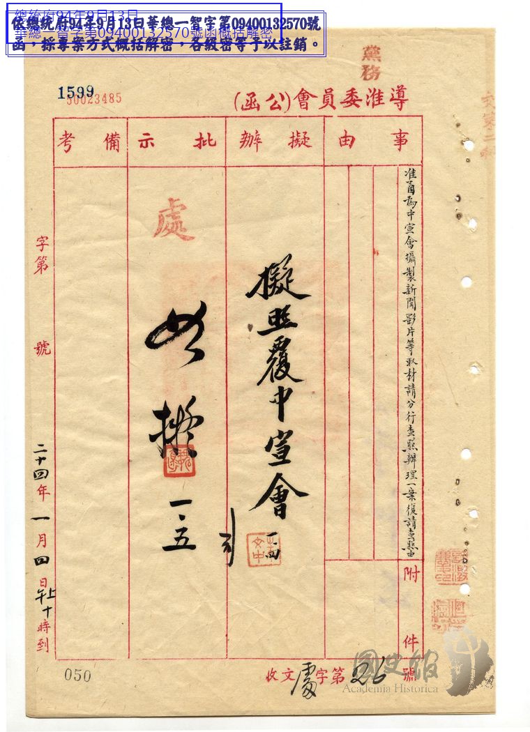 導准委員會委員長蔣中正函國民政府文官處有關中國國民黨中央執行委員會宣傳委員會攝製新聞影片等取材請分行查照辦理