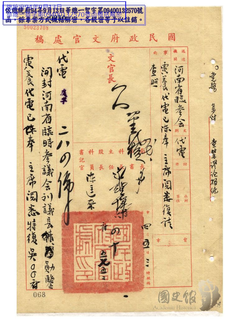 國民政府文官處電河南省臨時參議會議長劉精學有關京滬等地報紙雜誌對莫斯科外長會議主張國際干涉中國內政請查禁一案等情已奉主席閱悉復請查照