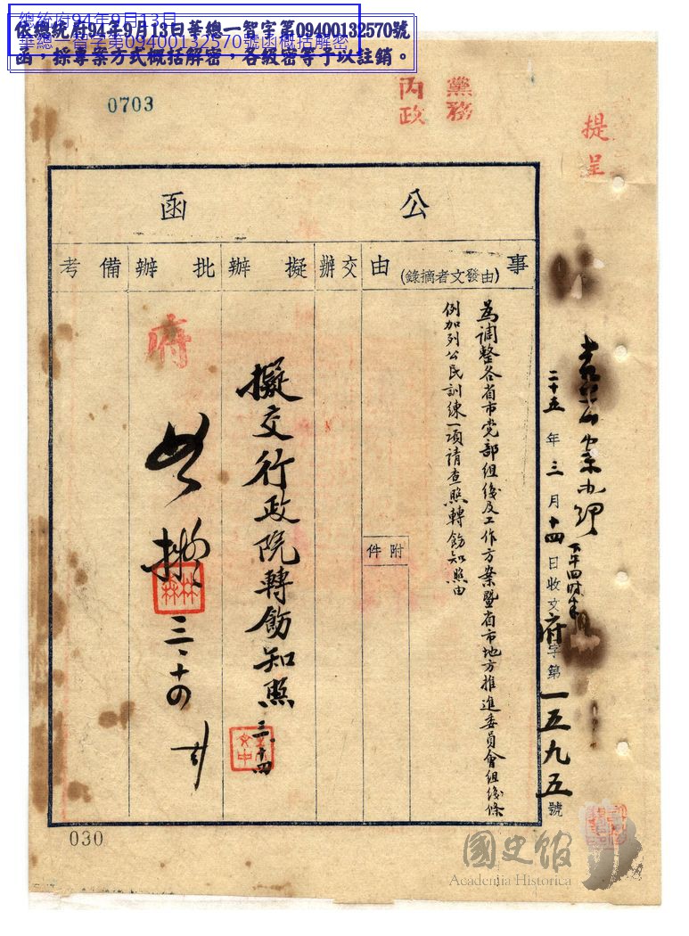 中國國民黨中央執行委員會函國民政府為省市地方推進委員會組織條例加列公民訓練一項請查照轉陳飭知