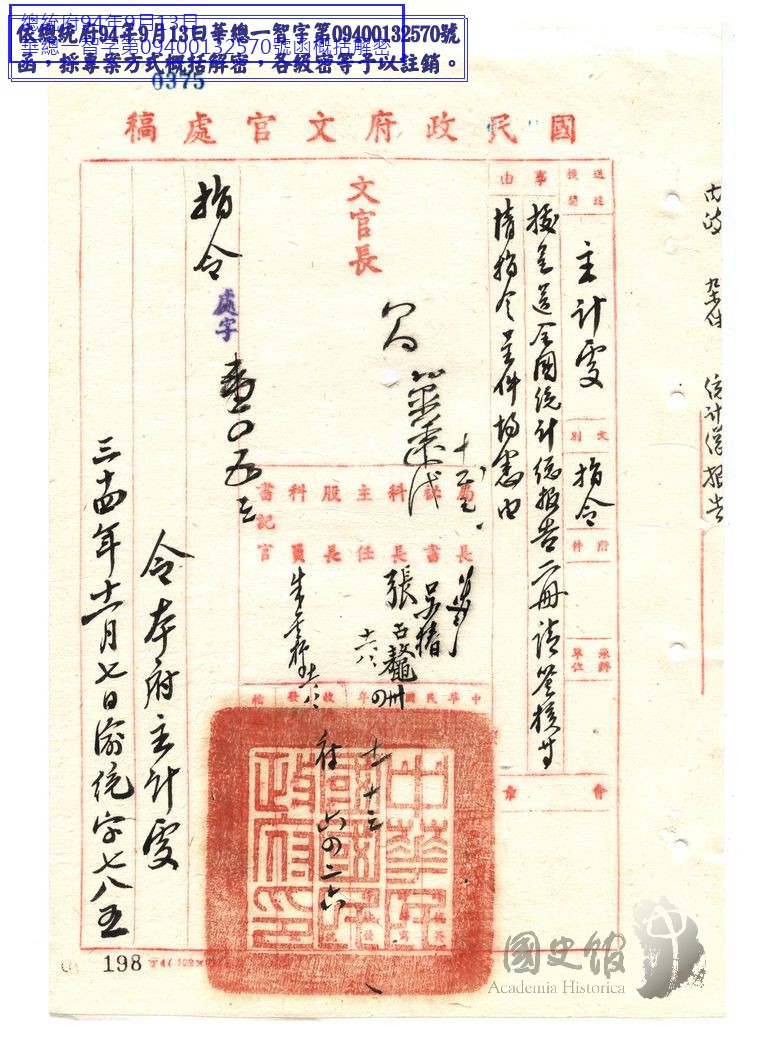 國民政府指令主計處所呈全國統計總報告三十四年輯均悉