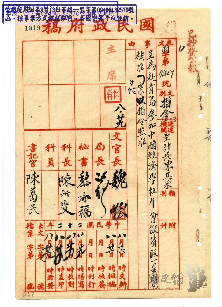 國民政府指令主計長陳其采准予自八月二十三日起請假一星期赴青島參加中國經濟學社年會