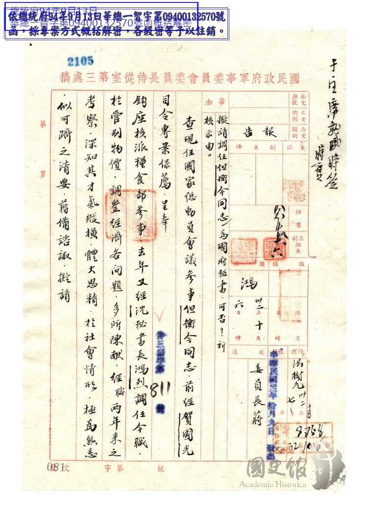 軍事委員會委員長侍從室第三處主任陳果夫呈委員長蔣中正請派任但衡今為國民政府文官處秘書