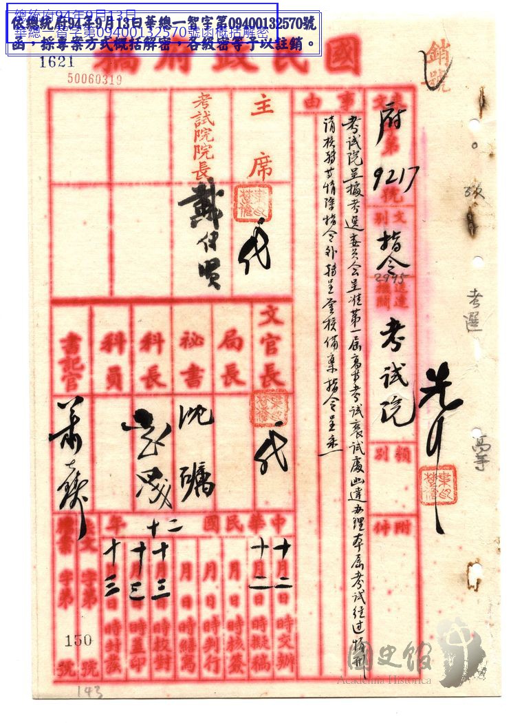 國民政府指令考試院為第一屆高等考試襄試處辦理本屆考試經過情形呈悉