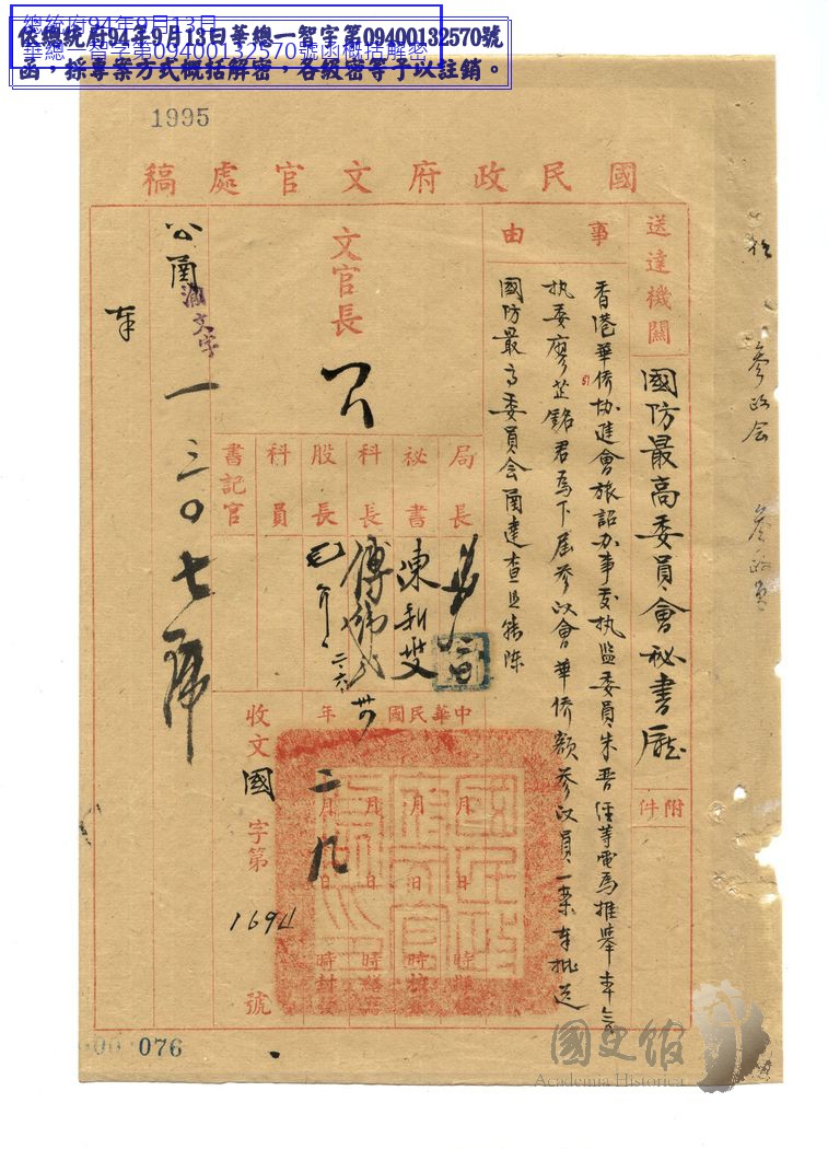 國民政府文官長吳鼎昌函國防最高委員會秘書廳為朱晉經等電為推舉本會執委廖芷銘為下屆參政員一案奉批送國防最高委員會函達查照