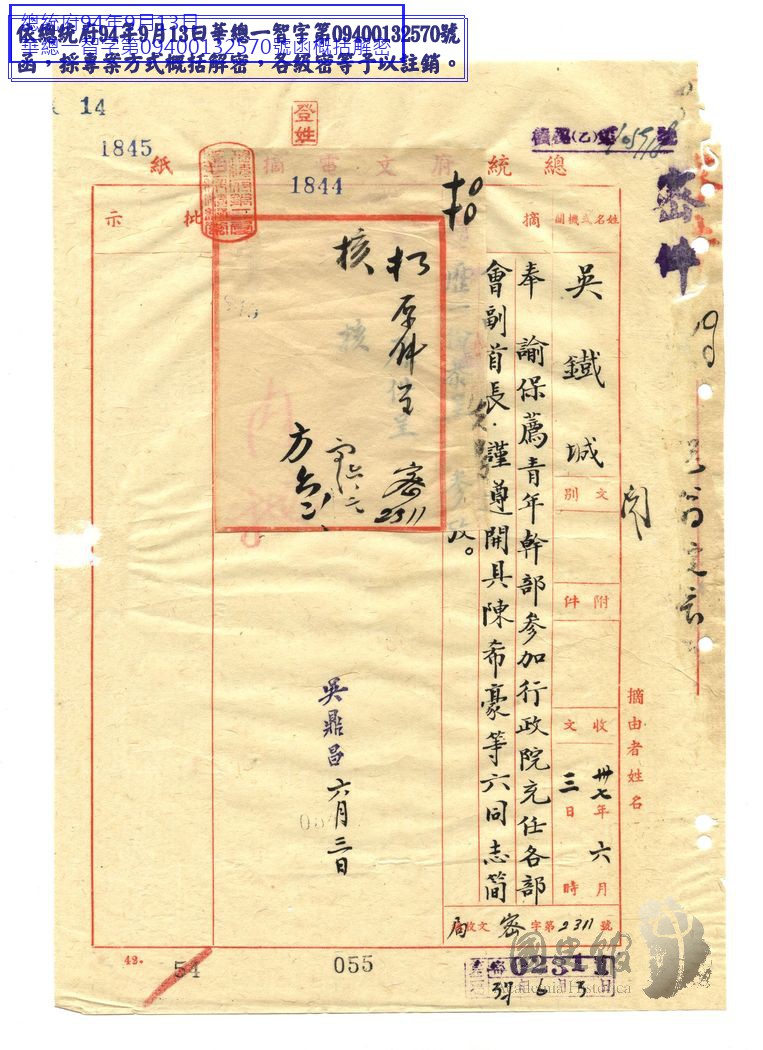 吳鐵城呈中國國民黨總裁蔣中正為保薦青年幹部參加行政院各部會副首長等因謹開具陳希豪等六人簡歷