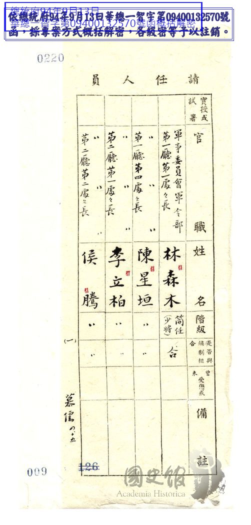 國民政府主席蔣中正令任命林森木等為軍事委員會軍令部第一廳第一處處長職等原任處長蔡文治等另用免職