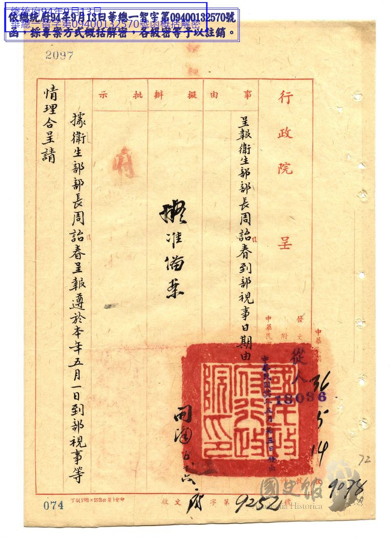 行政院長張羣呈國民政府為衛生部長周詒春到部視事日期