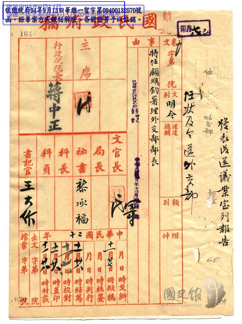 國民政府明令特任顧維鈞署理外交部長
