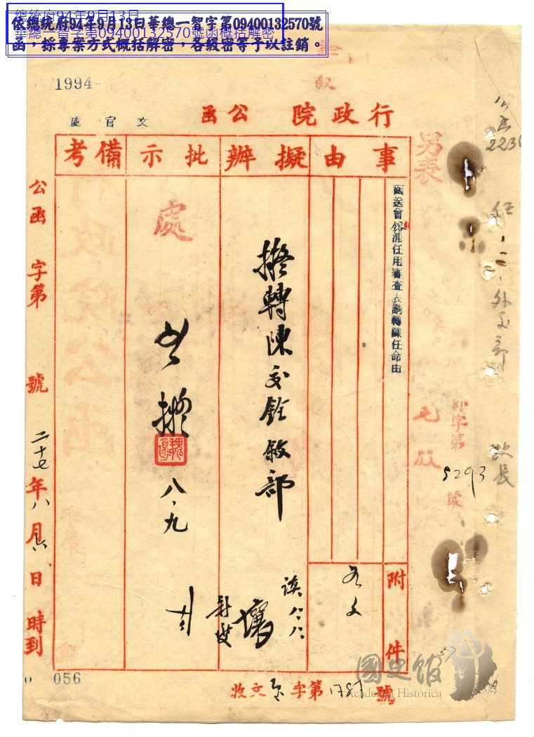 行政院長孔祥熙函國民政府文官處為曾鎔浦任用審查表請轉陳任命