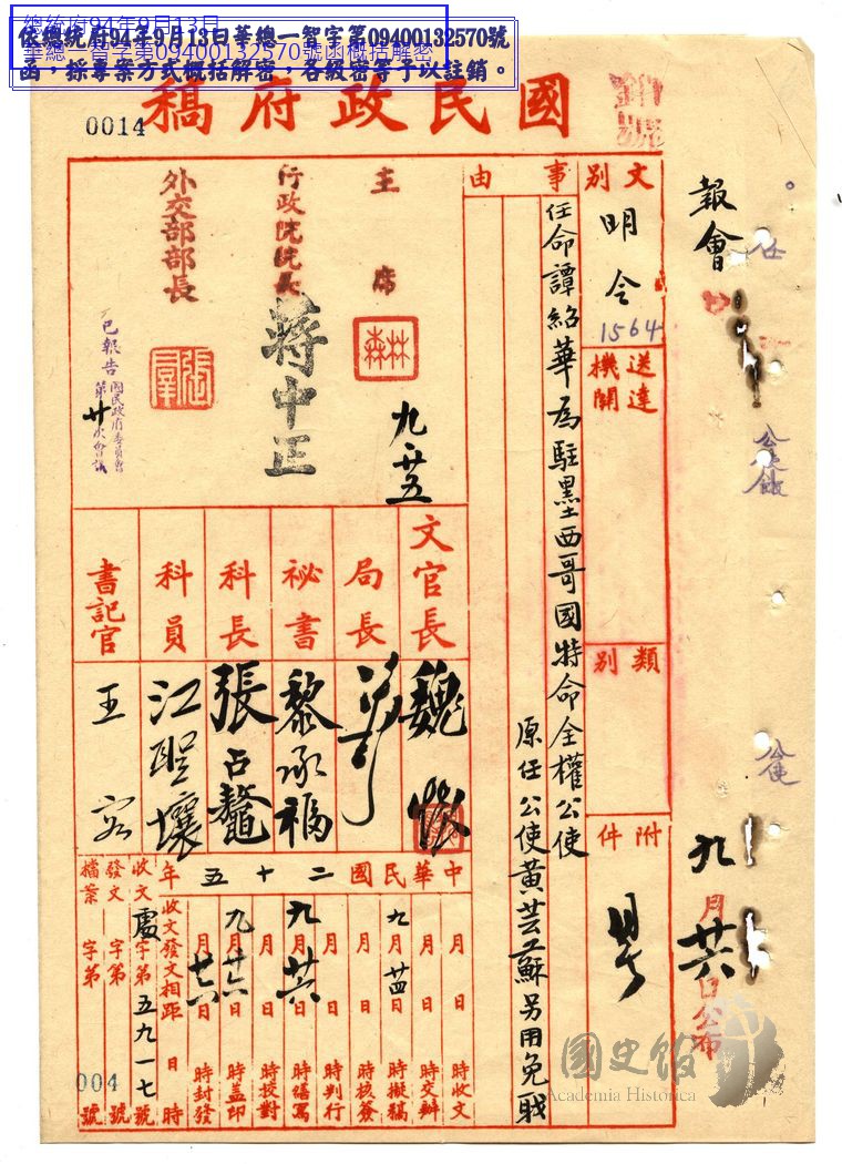 國民政府主席林森明令任命譚紹華為駐墨西哥國特命全權公使原任公使黃芸蘇另用免職