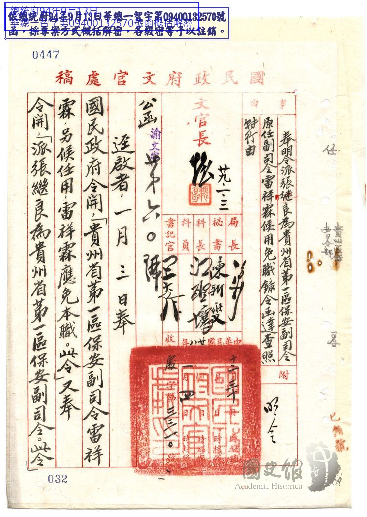 國民政府文官處函行政院為奉明令派張繼良為貴州省第一區保安副司令原任副司令雷祥霖候用免職錄令函達查照轉行