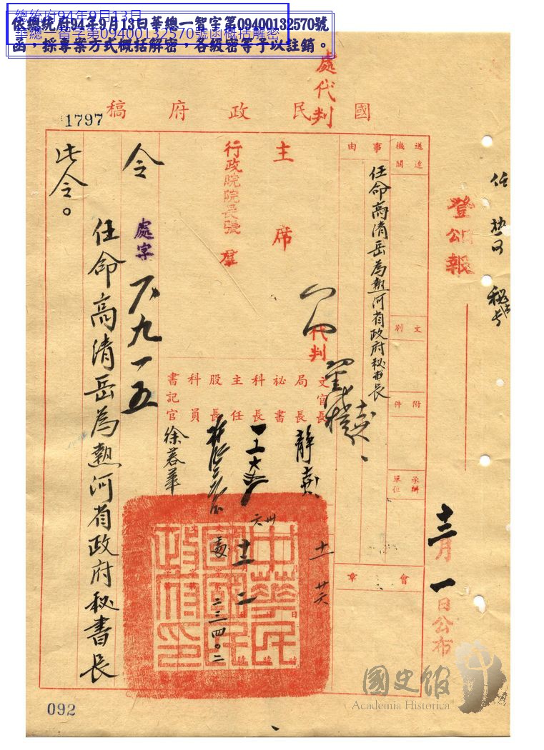 國民政府/人事/地方機關人員任免/省政府人員任免