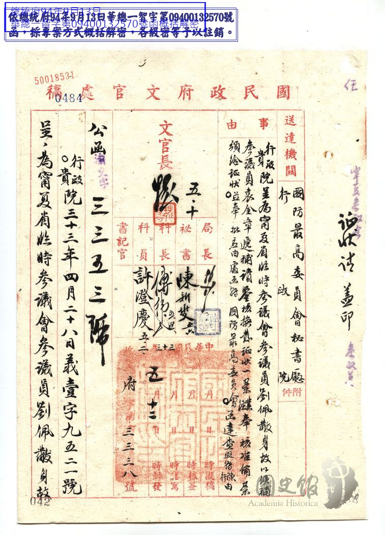 國民政府文官處函國防最高委員會秘書廳行政院有關寧夏省參議員劉佩黻身故以袁金章遞補一案業奉核准備案頒給證狀並函轉國防最高委員會函達查照轉陳