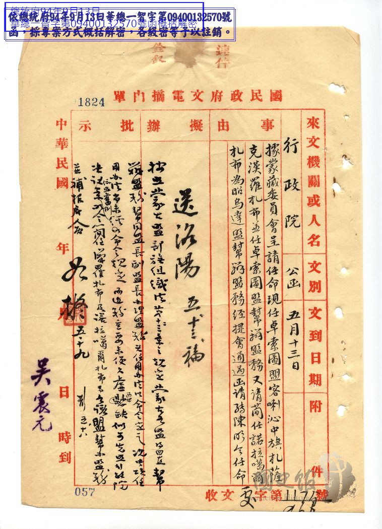 行政院長汪兆銘函國民政府文官處為據蒙藏委員會呈請任命現任卓索圖盟客喇沁中旗札蕯克漢羅札布兼任桌索圖盟幫辦盟務又請簡任昭烏達盟幫辦盟務經提會通過函請轉陳明令任命