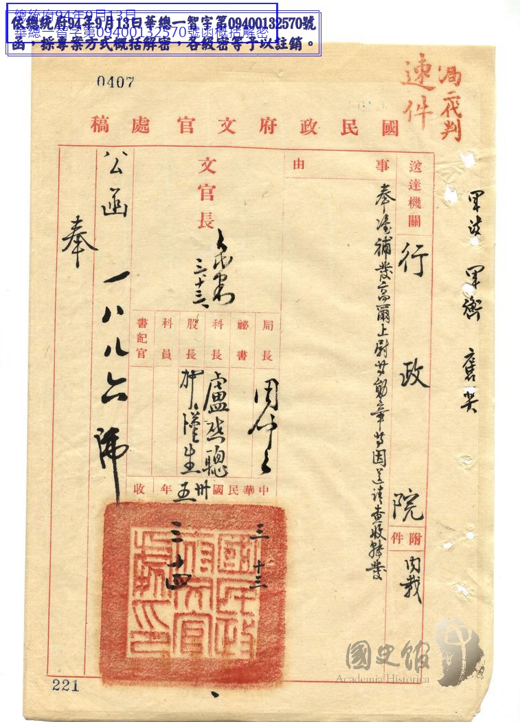 國民政府文官處函行政院為奉准補發高爾上尉等勛章送請查收轉發