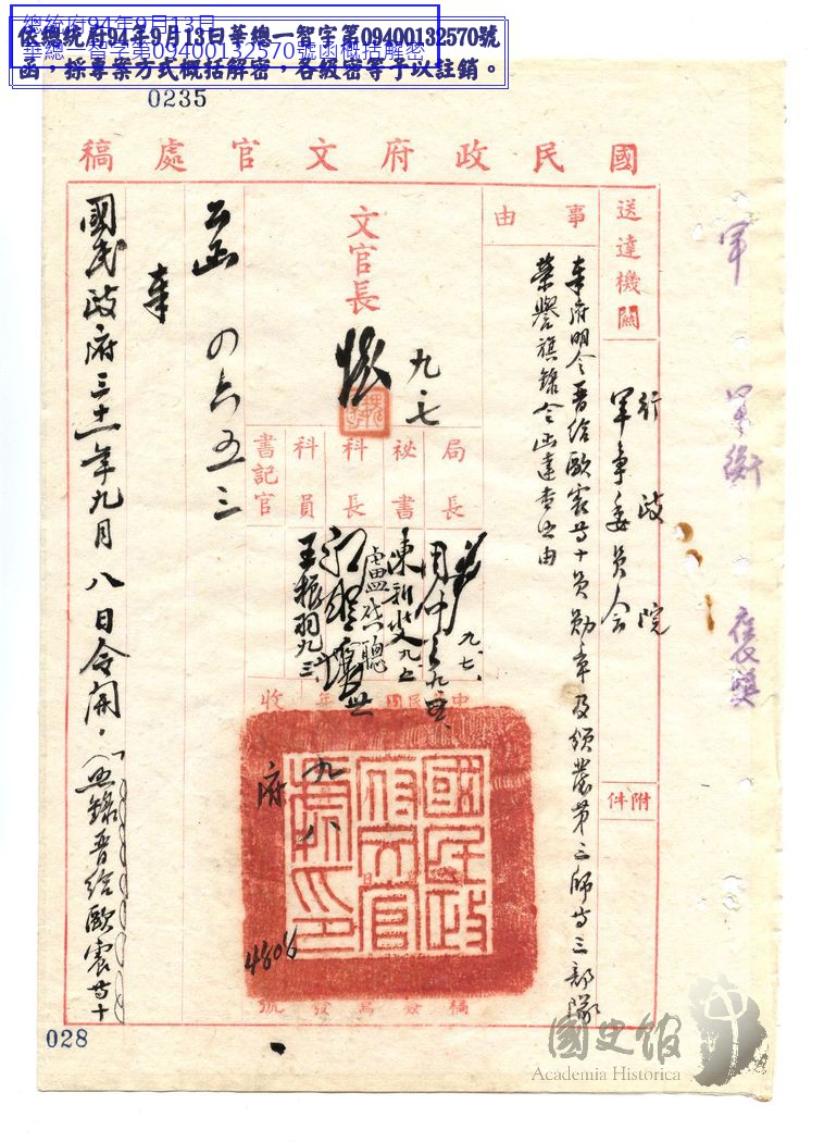 國民政府文官處函行政院及軍事委員會為奉府明令晉給歐震等十員勛章及頒發第三師等三部隊榮譽旗錄令函達查照