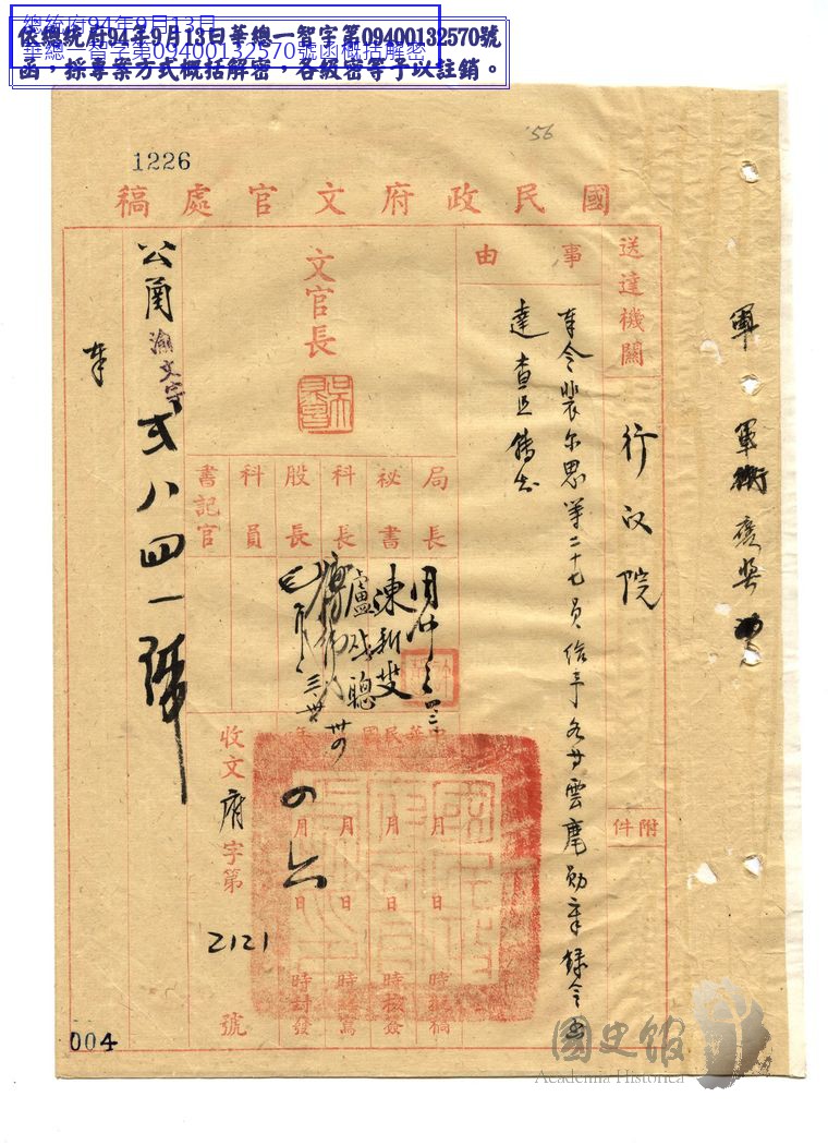 國民政府文官處函行政院為奉令裴爾思等二十七員給予各等雲麾勛章錄令函達查照轉知