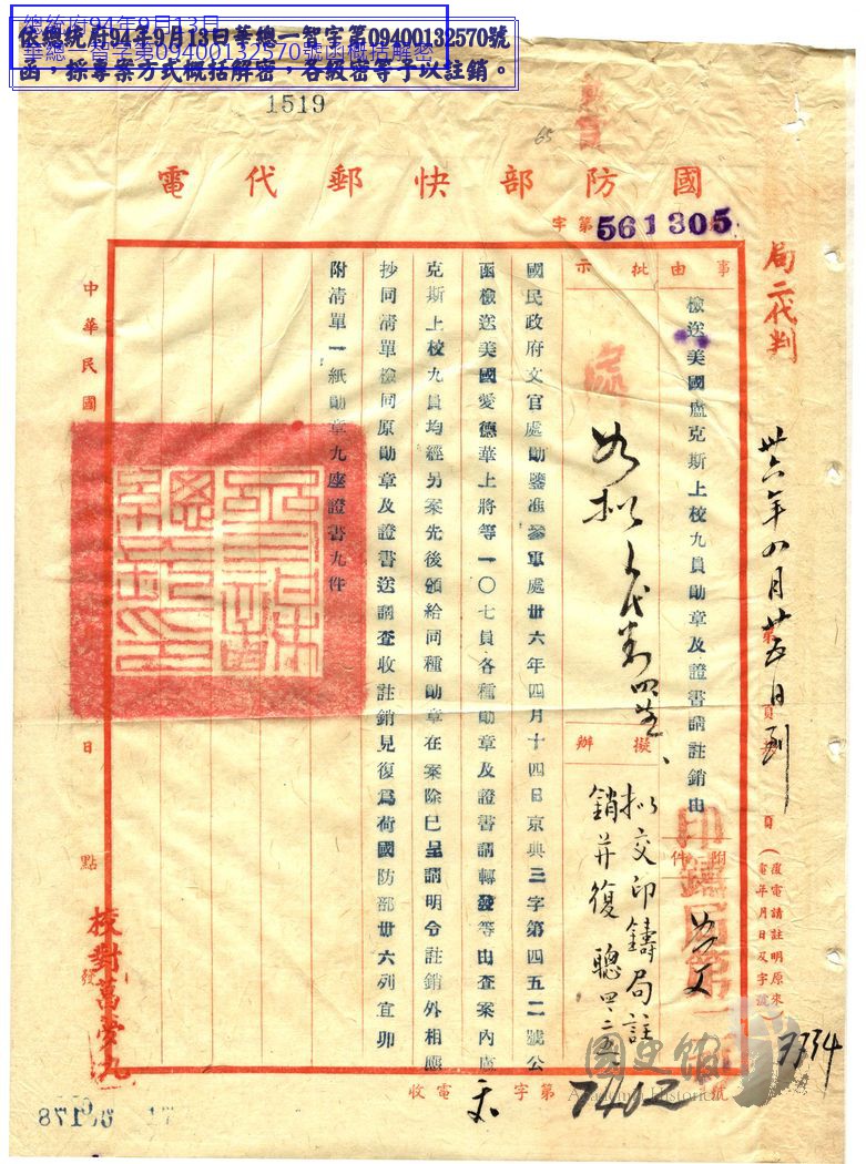 國防部電國民政府文官處為檢送美國盧克斯上校九員勛章及證書請註銷