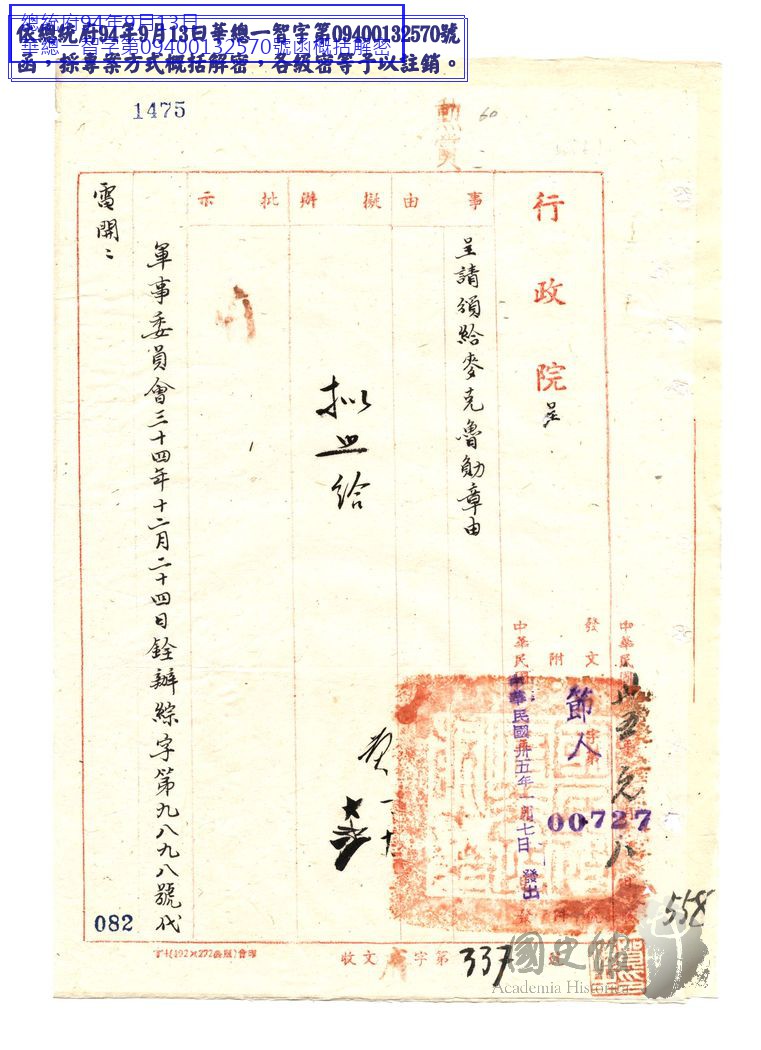 行政院院長宋子文呈國民政府為請頒給麥克魯勛章