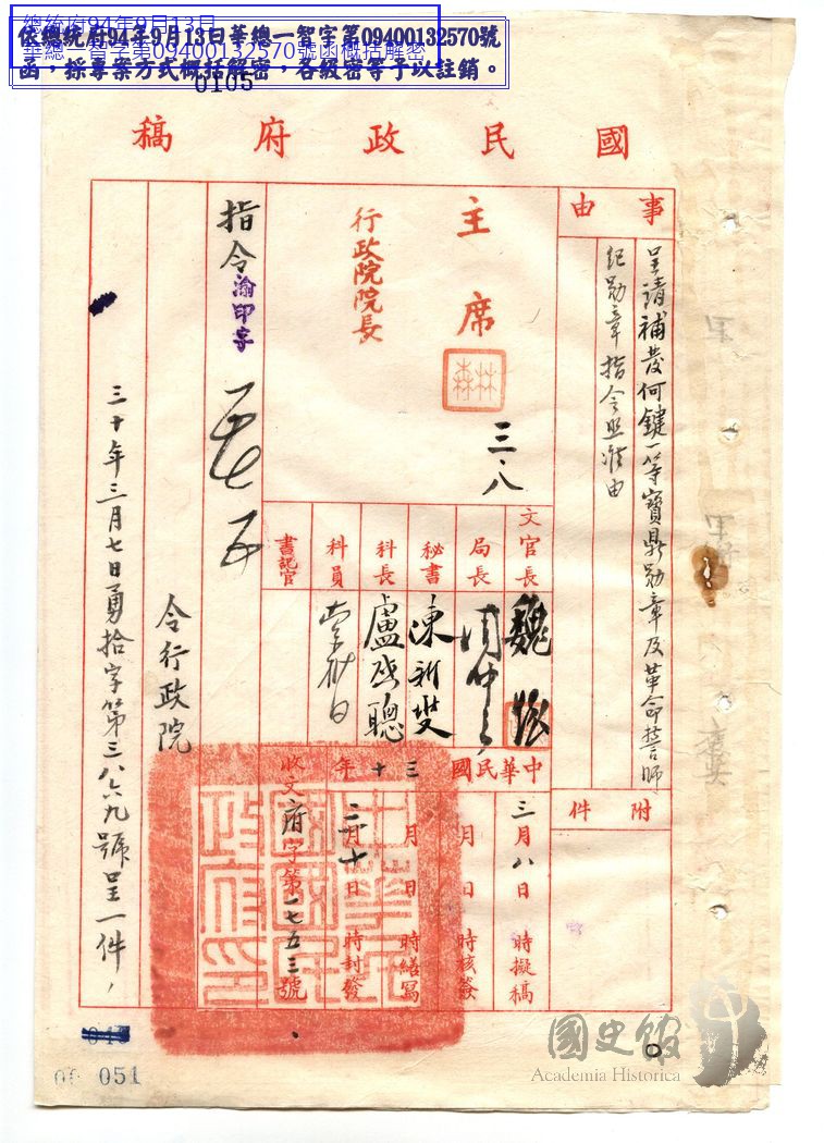 國民政府指令行政院為呈請補發何鍵一等寶鼎勛章及革命誓師紀勛章指令照准