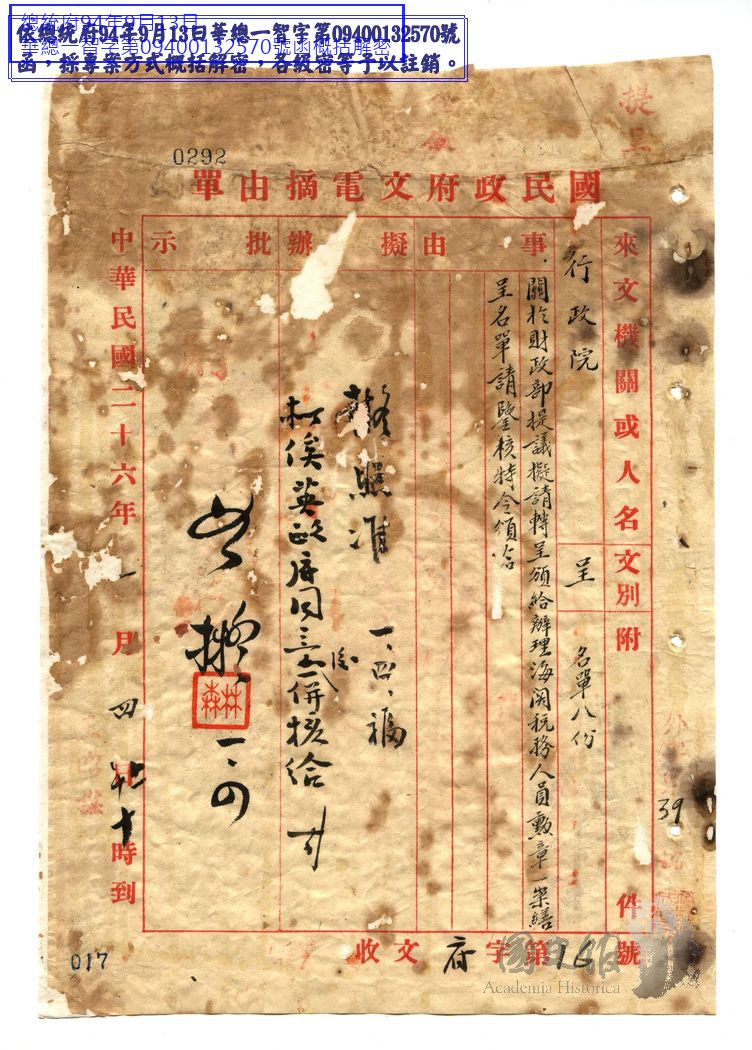 行政院長蔣中正呈國民政府主席林森關於財政部提議擬請轉呈頒給辦理海關稅務人員勳章一案繕呈名單請鑒核特令頒給
