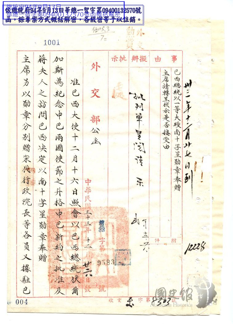外交部函國民政府文官處為外交部呈為巴西總統以一等大綬南十字星勛章奉贈主席是否接受請轉陳鑒核
